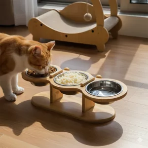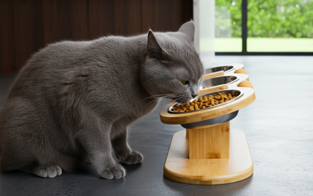 Le support en bois rend le repas élégant. Ça a aidé notre vieux chat à manger plus lentement et à mieux digérer. La cuisine reste plus propre.