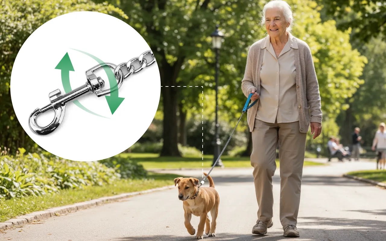 Bougez librement sans nœuds ni lignes torsadées. Le crochet astucieux pivote pour que les animaux restent en sécurité à vos côtés.