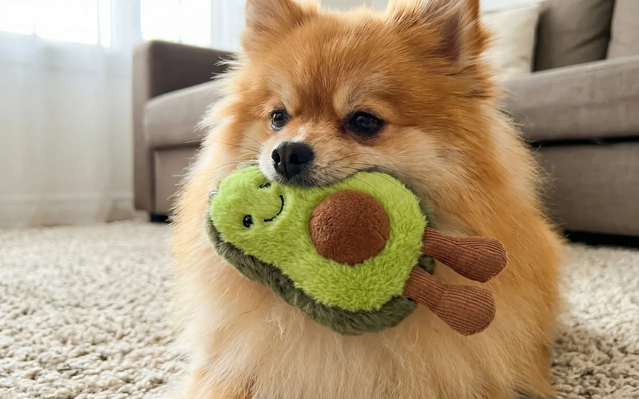 L’avocat est doux pour la bouche de Toby mais assez résistant pour ses séances de mastication énergiques. Je recommande vivement pour les petits chiens.