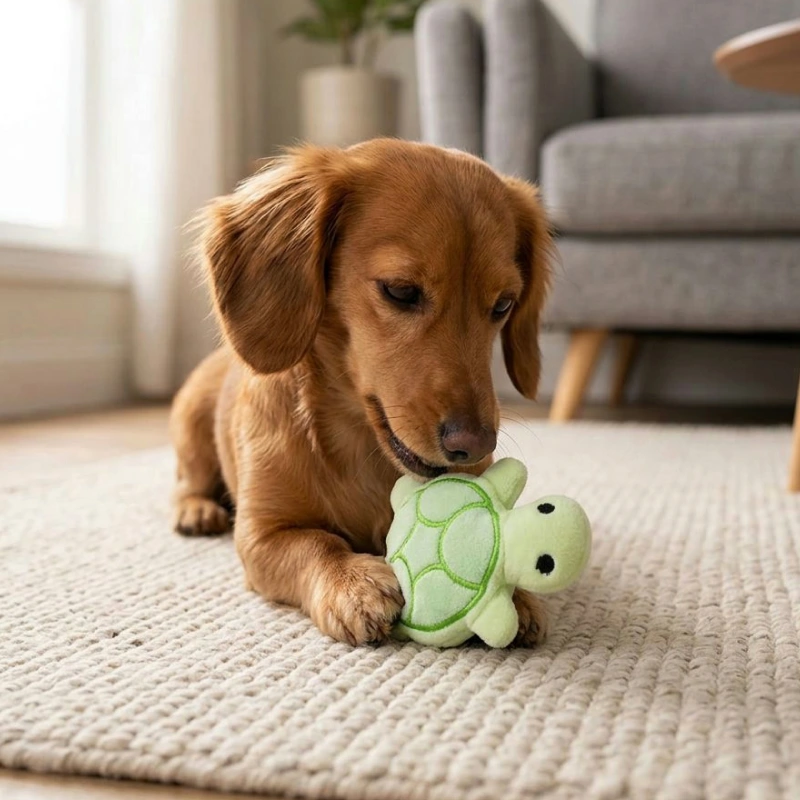 Tortue douce et qui couine, garde notre chiot calme et heureux.