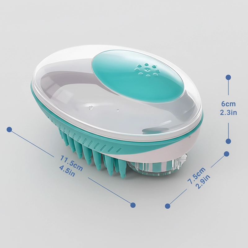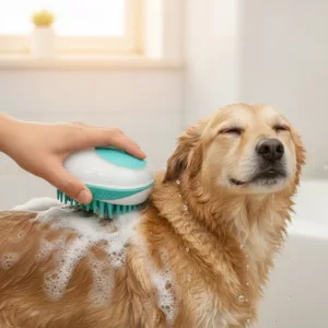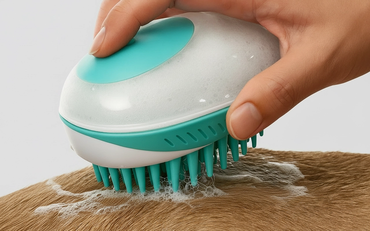 Cette petite brosse rend le bain tellement facile. Je mets du shampooing, je presse, et ça mousse tout de suite. Mon chiot reste calme tout le temps.