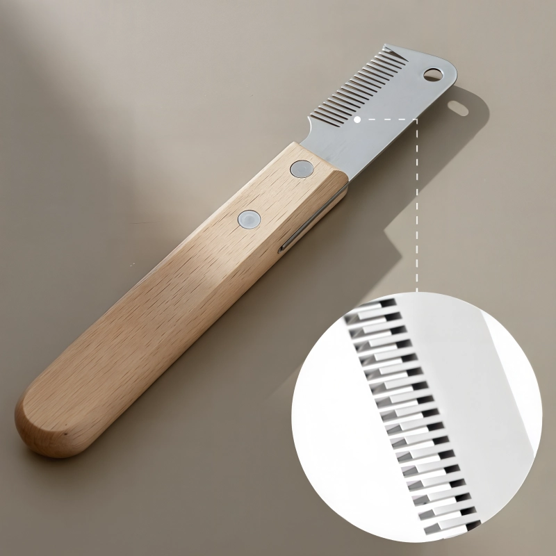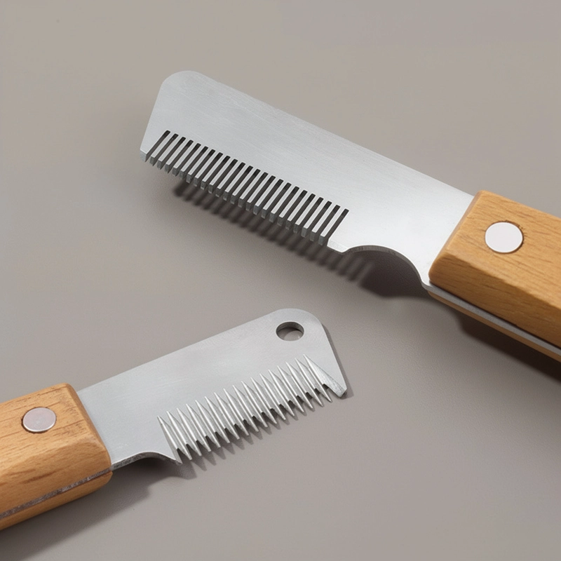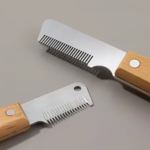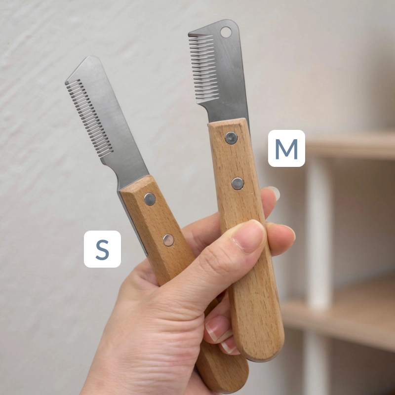 Vraiment ravie de ce couteau de toilettage. Mon golden retriever reste vraiment calme et son pelage est soyeux après. Le manche en bois est solide et ne glisse pas quand ma main est mouillée.