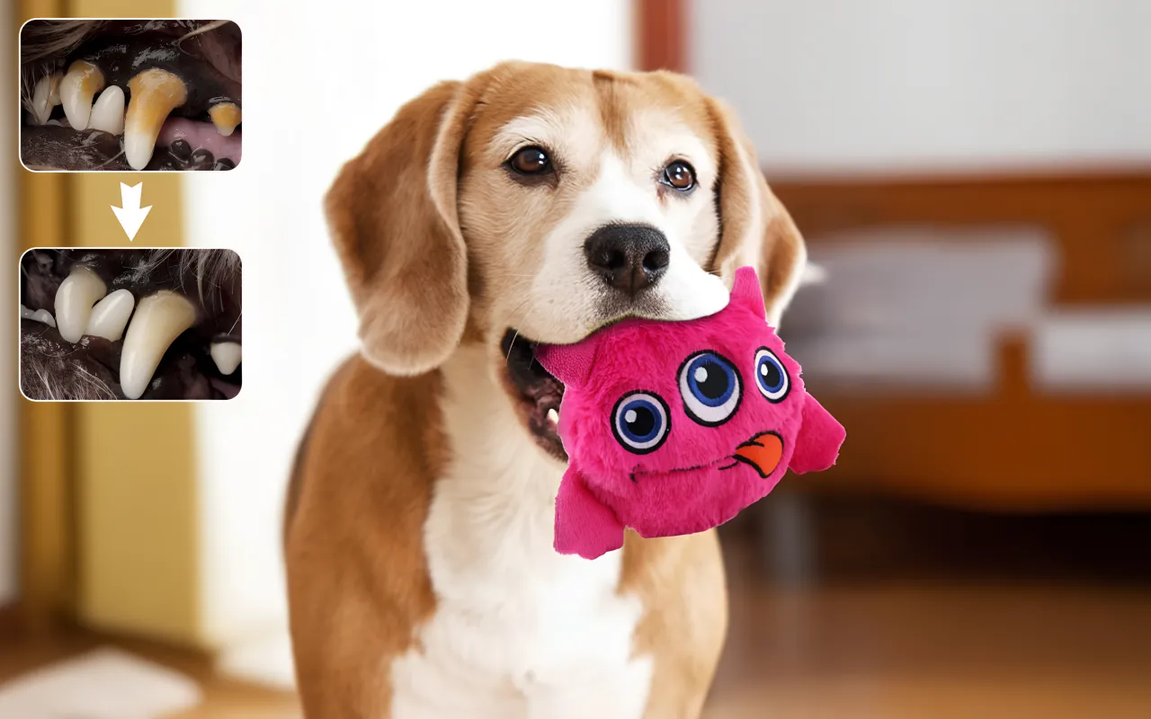 La housse en peluche protège doucement les dents et les gencives. Le design durable aide à résister aux morsures ludiques et à l'énergie débordante.