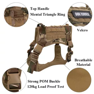Fabriqué en nylon durable et doté d’un matériel robuste, ainsi que de multiples fonctionnalités supplémentaires. Ce harnais tactique combine qualité et versatilité, ce qui en fait l’équipement parfait pour un usage de service, l’entraînement en plein air, la promenade quotidienne ou la randonnée d’aventure. Le système MOLLE (Modular Lightweight Load-carrying Equipment) pratique le long des deux côtés du harnais avec des panneaux à crochet et à boucle vous permet d’attacher une grande variété de poches, une bouteille d’eau et des équipements tactiques pour chiens, afin que votre compagnon canin puisse porter ses propres fournitures. Vous pouvez également attacher une gamme de patches et de badges pour personnaliser le harnais selon le style de votre chien, exprimer sa personnalité ou simplement pour identifier votre chien.