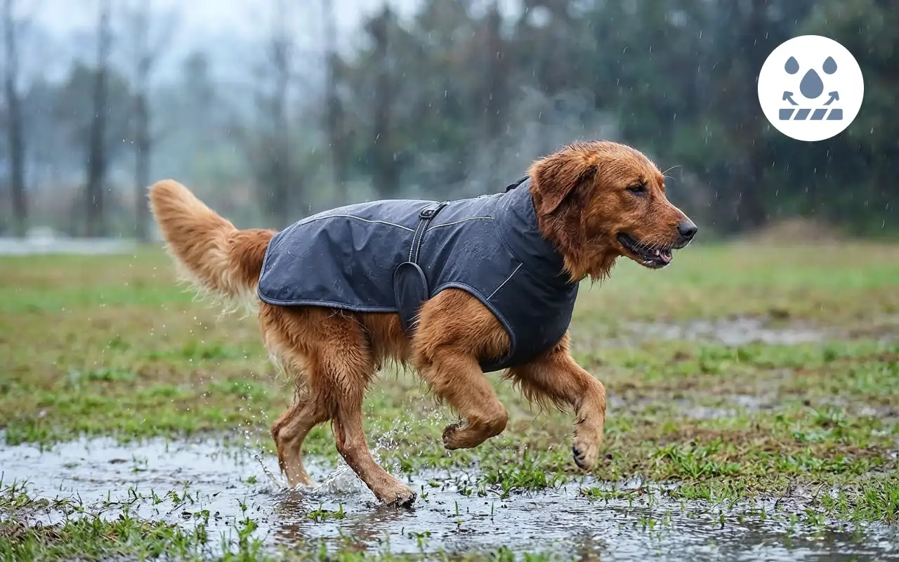 Les tissus empêchent l'eau de traverser après une averse ou de la neige. Les chiens restent secs, heureux et toujours prêts à s'amuser partout.