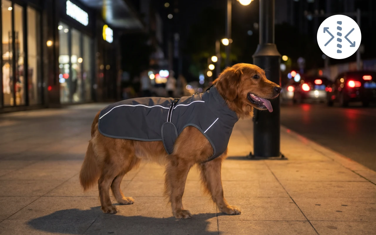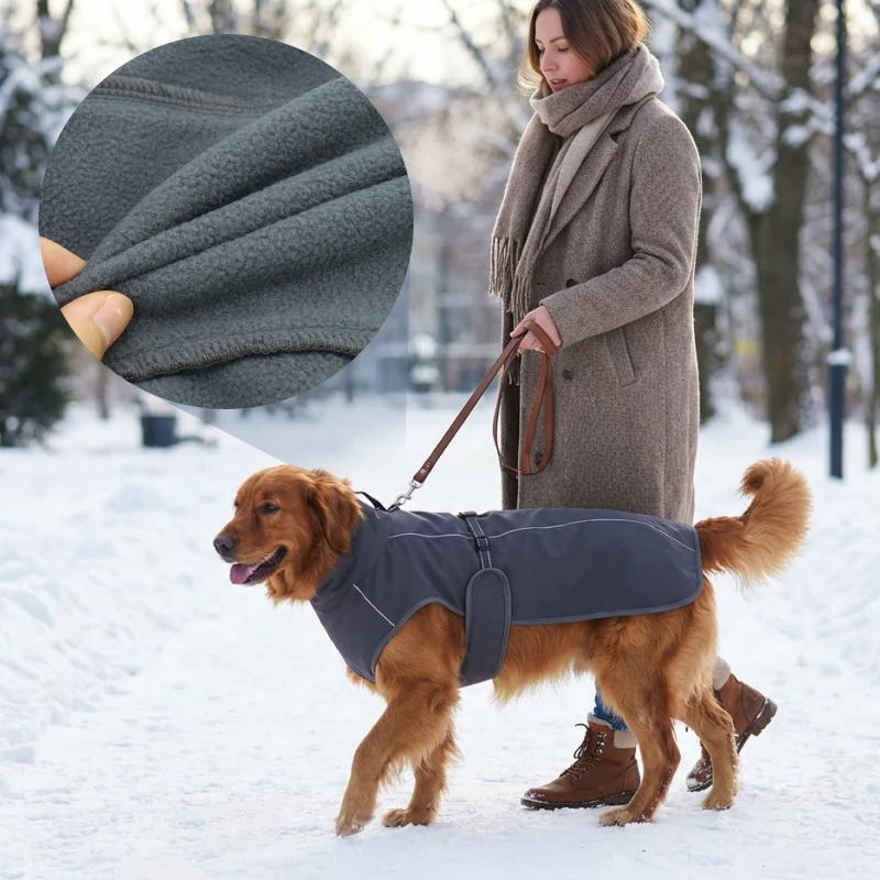 Les parties réfléchissantes rendent les promenades du soir beaucoup plus sûres. Mon chien est facile à repérer et reste bien au chaud même quand il neige dehors.
