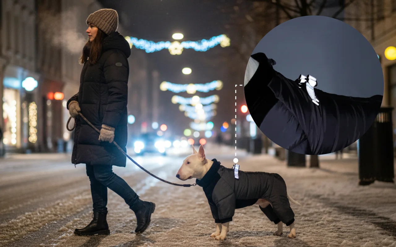 Mon chien adore porter son nouveau manteau d’hiver. Il le garde au chaud, et les bandes brillantes me rassurent quand je le promène la nuit.