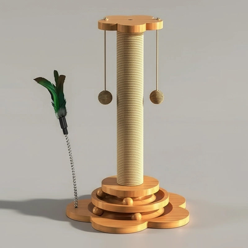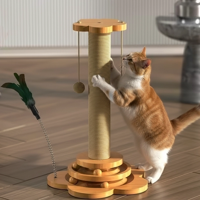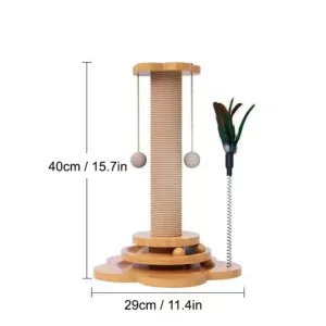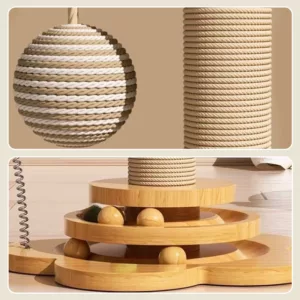 Griffoir en bois et sisal pour chat avec boules suspendues